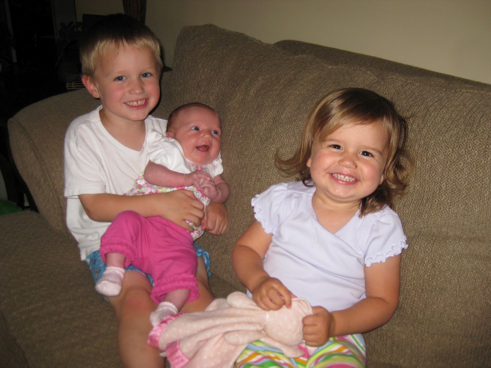 At two, MG has just learned to hop, which is so cute to watch. Her hops are now incorporated into bed jumping and dancing. She loves to dance and will boogie at the slightest hint of music. While her words are slowly coming along, she clearly understands everything we say. I have been surprised lately at her ability to follow pretty complex verbal directions. Not too shabby for a lady who is barely speaking! She does everything her brothers do, but always in a much more gentle fashion. If they clobber the baby, she pats her gently on the head. If they wrestle with Daddy, she piles on top for an extra hug. If they play chase, she runs after them, laughing and having a grand old time. The boys are very sweet with her and seem to enjoy taking care of their little sister (even if they can be a bit rough sometimes!) She takes it in stride, is a pretty tough cookie, loves her binky and NaNa (pink elephant) if sadness strikes, and otherwise, is a sweet little lady.